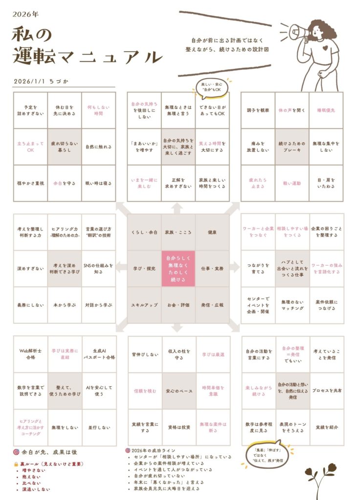 そのために、2026年は、人生ビンゴにプラスして、“ワタシ運転マニュアル”(マンダラチャート)も作ることにしました!